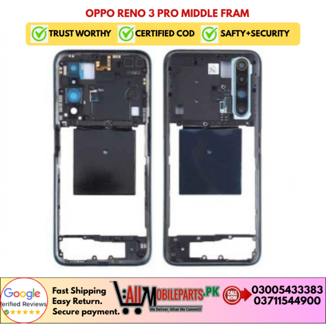 High-quality middle frame chassis for Oppo Reno 3 Pro. Perfect replacement for a bent, cracked, or damaged frame. Made with durable material for strong support and precise fitting of LCD, battery, and other internal parts. 100% tested for quality and perfect alignment with original components.